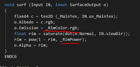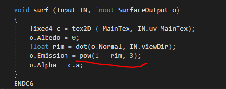 현재 ndotv의 크기 변환은 선형적으로 일어난다. 림라이트(RimLight) 구현을 위해선 외곽선을 나타내는 하이라이트 빛의 굵기가 줄어들어야한다. 이를 위해 pow 함수로 제곱해줌으로써 빛의 굵기를 가늘게 해줬다.