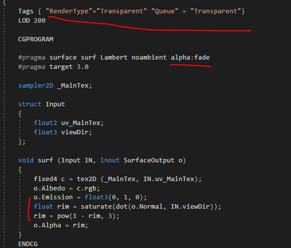 먼저 프래그먼트 뒤에 위치한 면들도 보여주기 위해 transparent 처리를 해줬고 alpha는 fade하도록 설정했다.