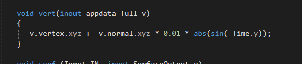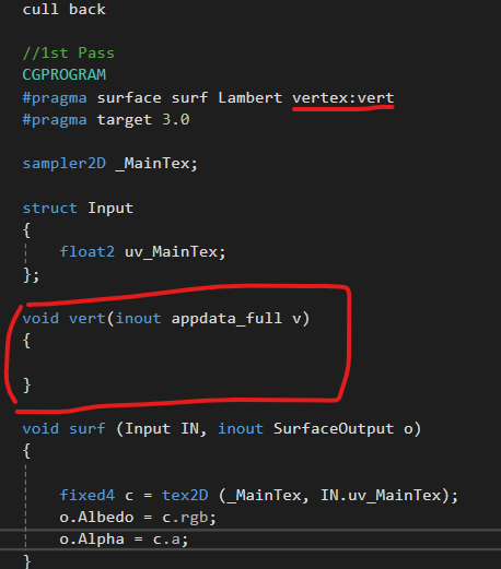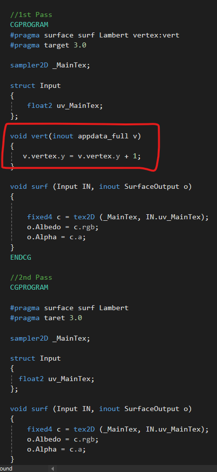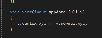 위와 같이 vertex:vert를 작성해줘 vertex shader는 vert라는 함수에서 일어나는 것을 명시해준다.