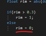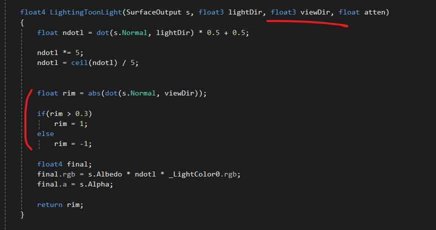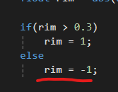 noambient를 제거하고 rim의 하한선을 0으로 설정한다면 아래와 같이 아웃라인이 희미해지는 구간이 생겨버린다.