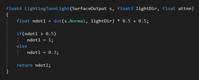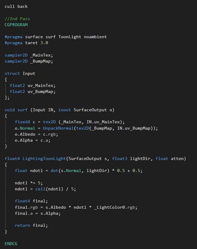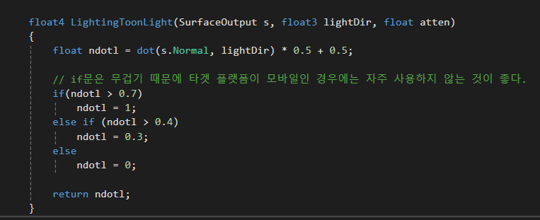2nd Pass의 하프램버트 구조를 적용한 커스텀 라이팅에서 끊어지도록 설정해봤다. 하프램버트를 사용한 이유는 계산이 좀 더 명확해지기 때문이다.