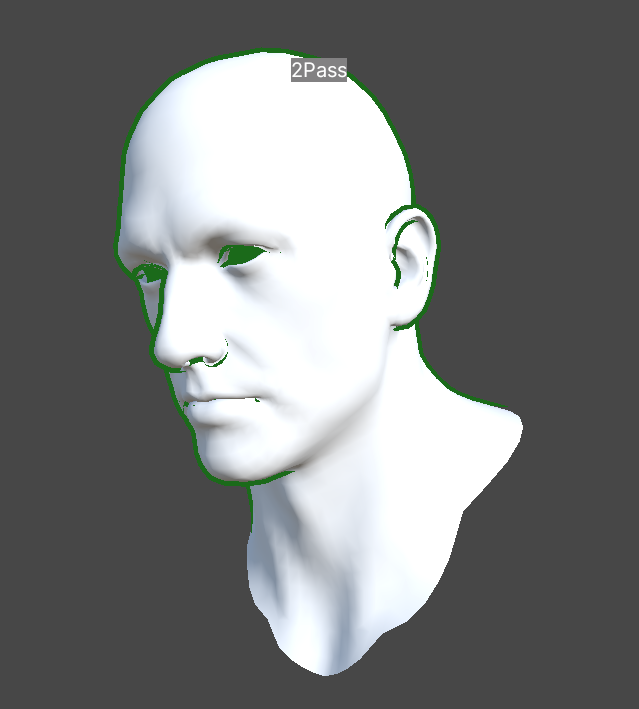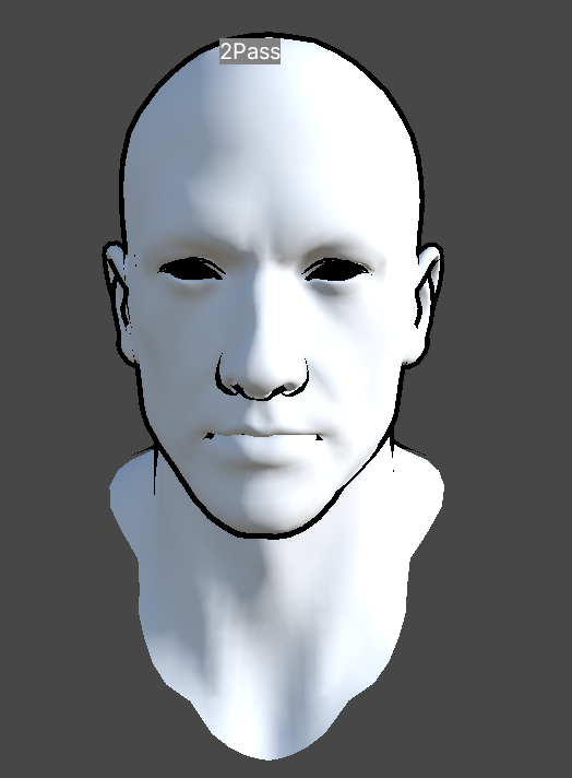 | 2Pass 이용 | 먼저 Pass란 '한 번 그리는 것'을 뜻한다.그러므로 2Pass는 두 번 그린다는 뜻이다. (1) 완전히 검게 그린다 (2) 크기를 키워서 그린다. : 정확히 말하자면 그냥 스케일을 키우는 것이 아니라 '노멀 방향으로 확장'을 이야기 하는 것이다.) (3) 노멀을 뒤집는다. : 3ds Max에서 면을 뒤집는다는 행위는 'Normal을 뒤집는다'라고 표현하지만, 엔진에선 보통 노멀을 뒤집지 않고 '앞면을 날리고 뒷면만 그리는 Front Face Culling'을 쓰기 때문에 보통 노멀을 뒤집지 않는다. |