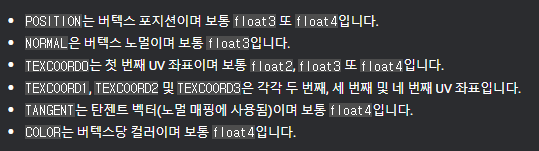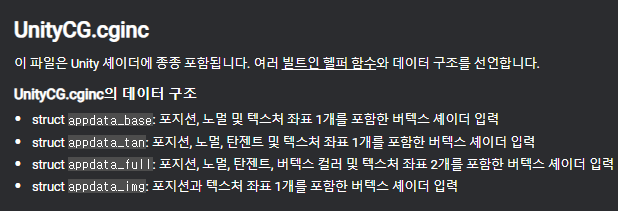 파라미터는 appdata_full 구조체를 받고있다. 이는 UnityCG.cginc에 내포된 데이터로 공식 문서를 확인하면 아래와 같은 종류가 있는 것을 확인할 수 있다. (링크)