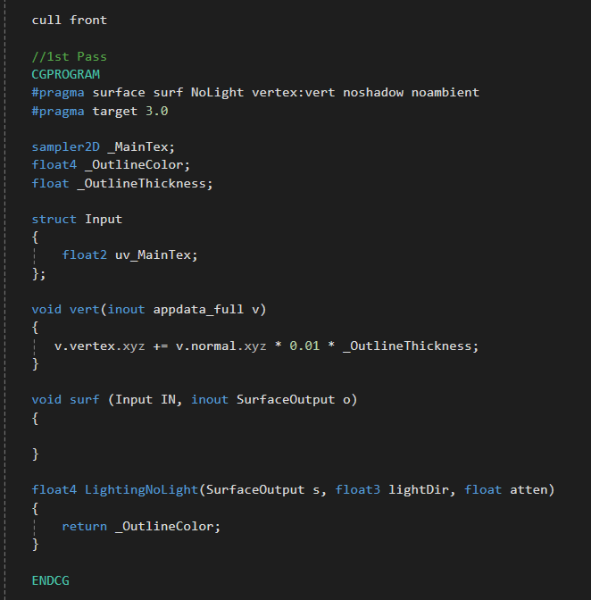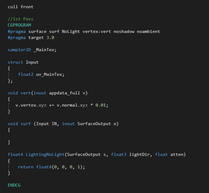 노말 방향으로 확장된 물체를 그리도록 하였고 NoLight라는 커스텀 라이팅 구조를 작성했다. 색깔은 검은색으로 고정해줬고 cull front 키워드를 통해 앞면을 컬링하도록 하였다.