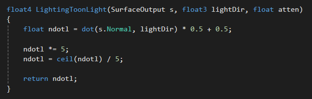 또 다른 방법으론 ceil이라는 올림 함수를 이용하는 것이다. 이를 이용하면 0~1 범위였던 ndotl을 0~5범위로 정수형태로 늘린 뒤 5로 나누면 1, 0.8, 0.6, 0.4, 0.2, 0 과 같이 층을 여러개 만들어줄 수가 있다. 5의 값을 조절하면 레이어의 개수를 조절할 수 있겠다라는 생각이 들었다.