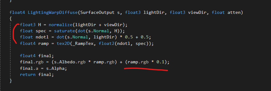 그럴싸해졌다. 여기서 앞서 배운 Half Vector와 노말의 내적인 스페큘러를 적용하고 ramp texture의 rgb값을 10% 증가시켜보겠다.