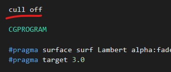 Default값이 cull back이기 때문에 일어나는 현상인데 뒷면도 렌더링해주기 위하여 이를 무시하고 cull off키워드를 추가해줬다.