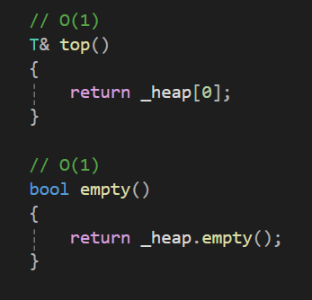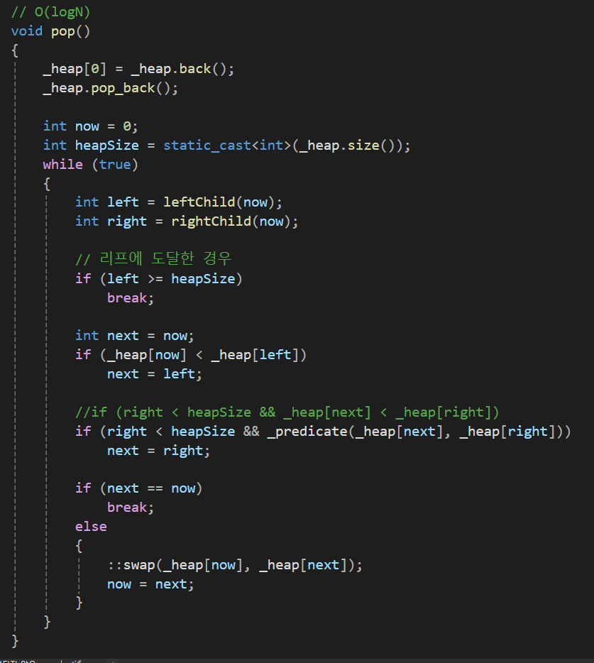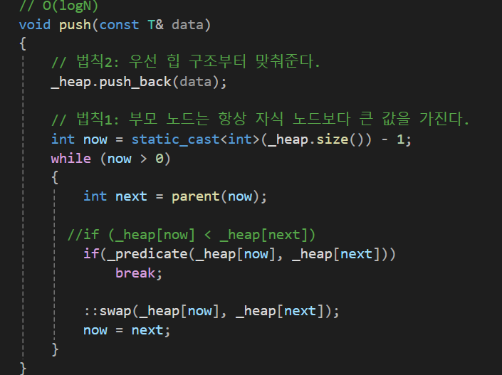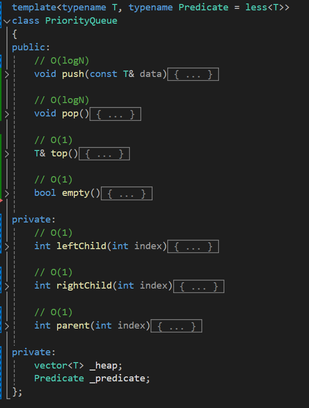 기본적인 뼈대는 아래와 같다. template(C#에선 Generic)으로 컨테이너가 담을 데이터의 형태를 일반화 시켜주고 두번째 타입네임에는 조건식(Predicate)을 받아줌으로써 최소힙(Min Heap) and 최대힙(Max Heap)을 따로따로 구현해줄 필요 없이 하나의 컨테이너에서 원할때마다 최소값, 최대값을 반환받을 수 있다.