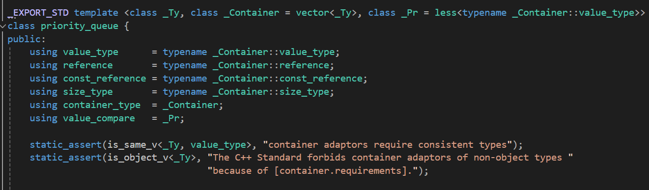 표준 컨테이너 라이브러리를 확인해보면 priority_queue의 구조는 위와 같이 vector리스트로 데이터를 담는 것이 기본값이지만 원한다면 다른 종류의 컨테이너로 담을 수 있다.