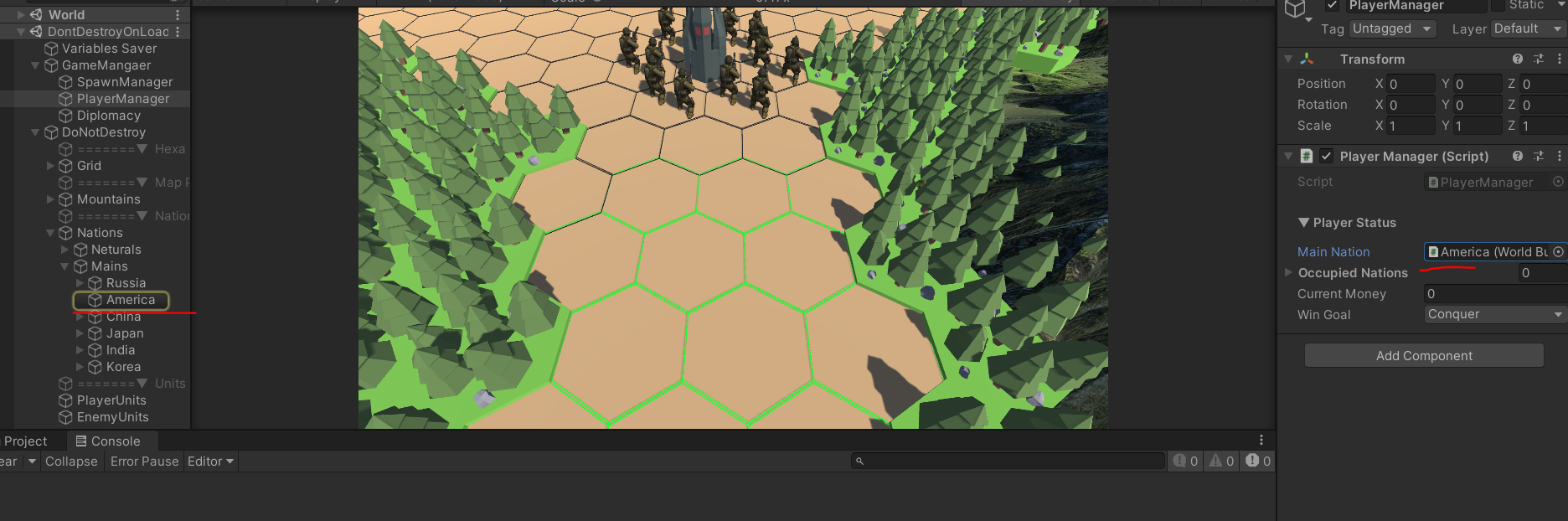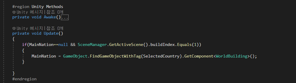 it finds out the player-selected nation in World scene with the saved information beforehand.