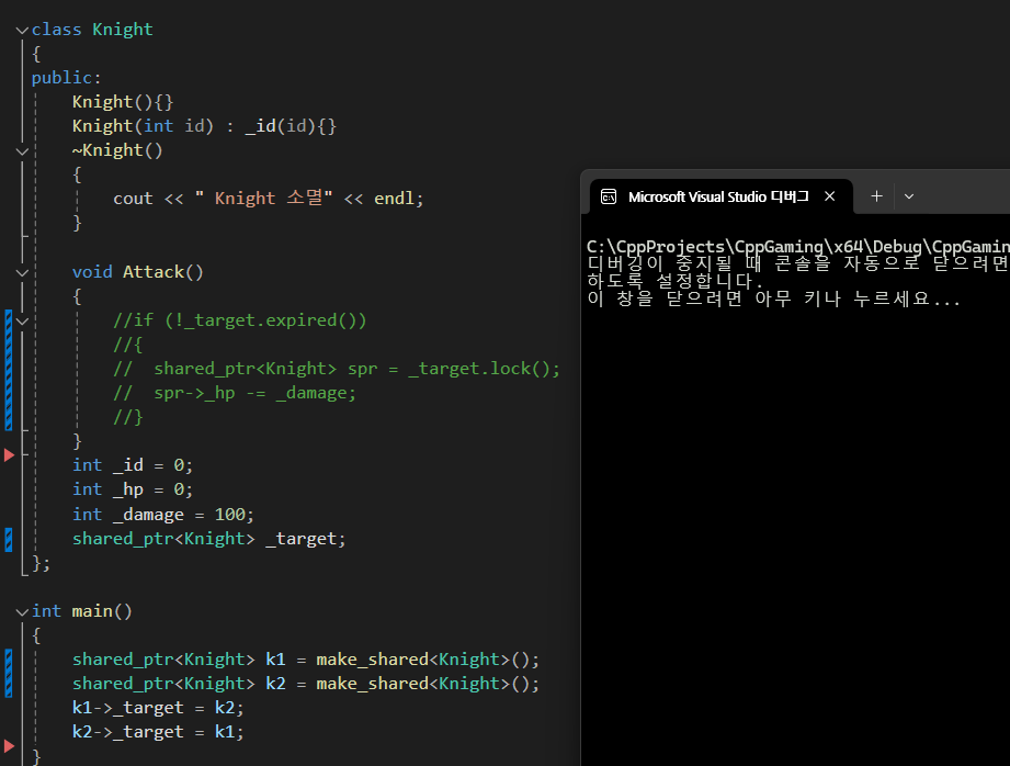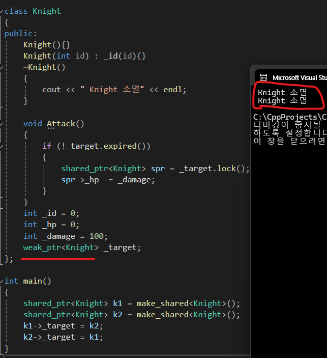 shared_ptr만 사용할 경우 위와 같은 문제가 발생할 수 있는데 weak_ptr까지 사용한다면 예방할 수가 있다.