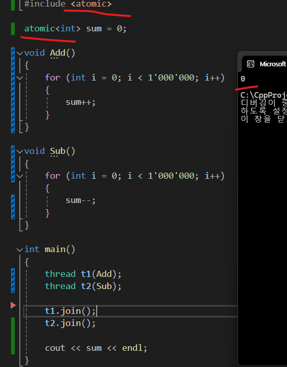 먼저 atomic을 사용하기 위해선 #include <atomic>을 헤더에 추가해주고 아래와 같이 변수를 선언해줘야 한다.
