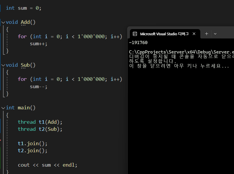 하지만 만약 백만번씩 실행한다고 했을 때 여전히 우리가 생각하는대로 0이 될까? 이를 코드 수정 후 확인해보면 아래와 같이 엉뚱한 값이 나오는 것을 볼 수 있었다.