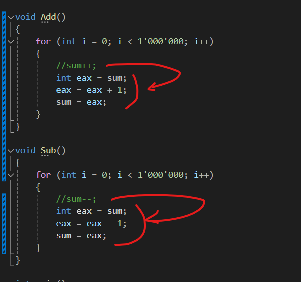 이유는 어셈블리를 까보면 ++ 혹은 --하는 코드는 아래 세 단계로 이루어져 있기 때문이다.