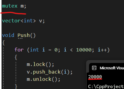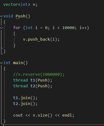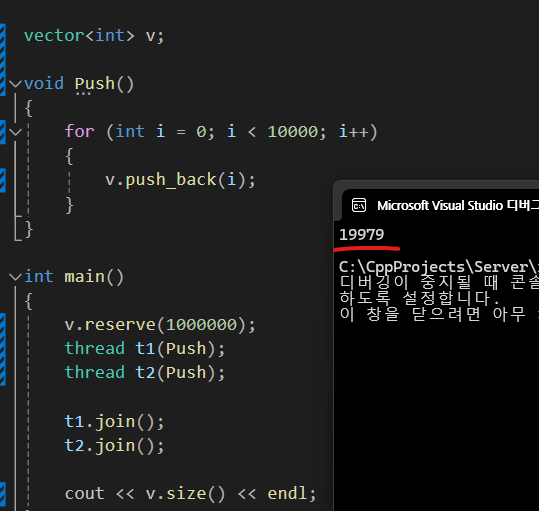 이상한 값이 나오는 이유는 Thread1이 벡터의 마지막 요소에 push_back하려고 할 때 Thread2도 마지막 요소에 push_back을 하려고 한다면 하나의 메모리에 데이터 두 개를 동시에 집어넣으려고 하는 경쟁상태가 발생한다.