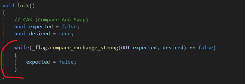 스레드 1, 2, 3,... 이 있다고 가정하고 우리가 표준에서 제공하는 mutex가 아니라 직접 Lock을 만들어 사용했을 때 생길 수 있는 상황 중 스레드 1, 2가 동시에 코드를 호출하여 Lock을 해버릴 경우 둘이서 동시에 영역을 차지하려고 하는 문제가 발생한다. 이때 크래쉬가 일어나는데 이러한 현상을 해결하는 방법은 스핀락이다.