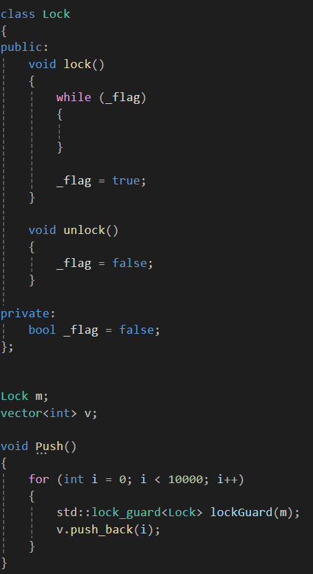 예로 아래 Push함수를 Thread1, Thread2가 실행한다고 했을 때 언젠가는 타이밍이 엇나가 _flag가 true인 상태로 데드락(deadlock) 상황이 발생할 수 있다.
