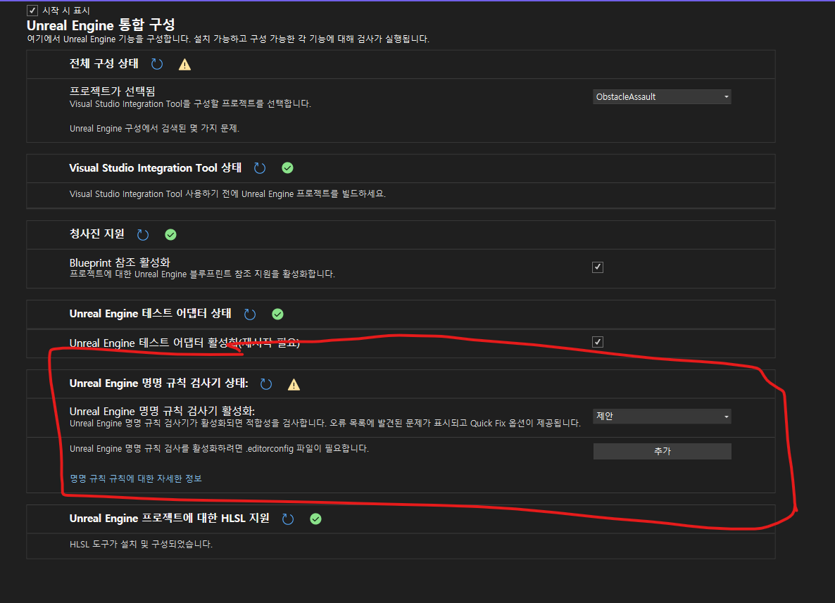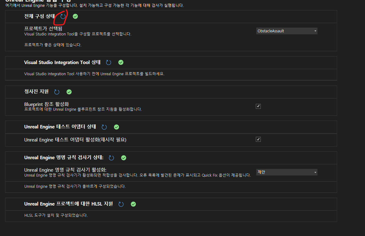전체 구성 상태 확인을 돌리면 Unreal을 위한 필요 요소들이 전부 설치 혹은 세팅이 되어있는지 확인해준다.