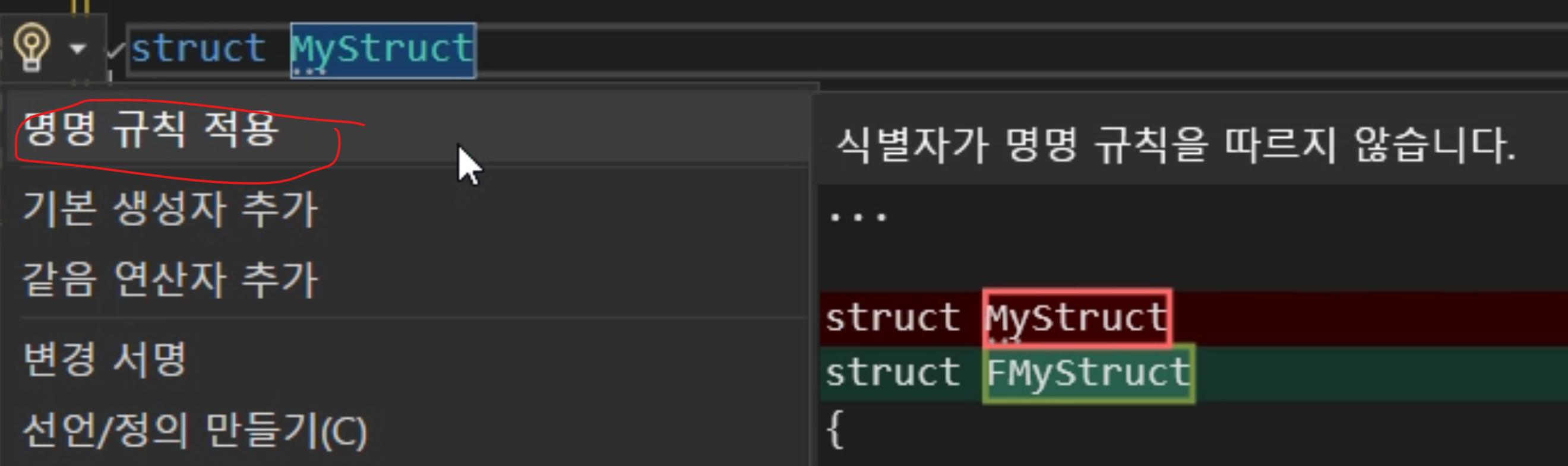 아래 MyStruct 이름으로 구조체를 선언해주면 해당 구조체가 명명 규칙을 따르지 않고 있다고 알려준다. 이를 적용시켜주면