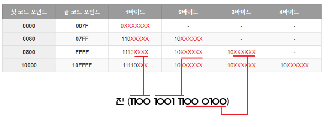 | 첫 코드 포인트 | 끝 코드 포인트 | 1바이트 | 2바이트 | 3바이트 | 4바이트 |