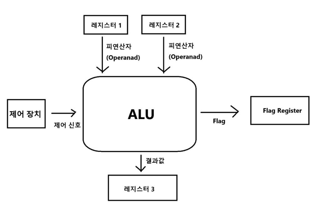 (1)는 레지스터로부터 불러오고 (2)는 제어장치로부터 제어 신호를 통해 불러옴.결과값은 레지스터에 저장한다.
