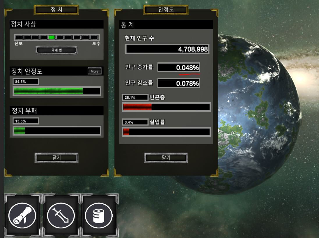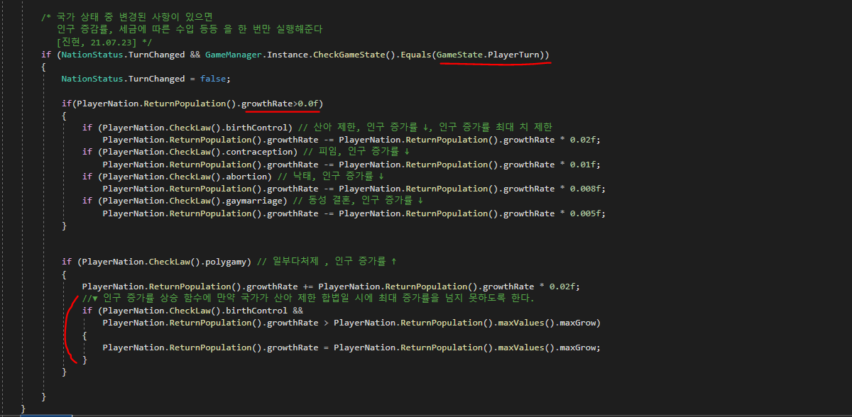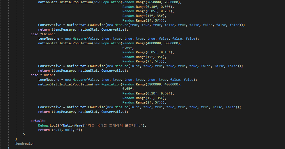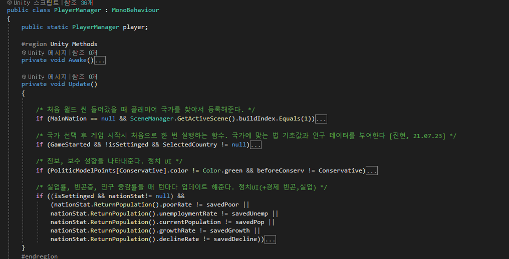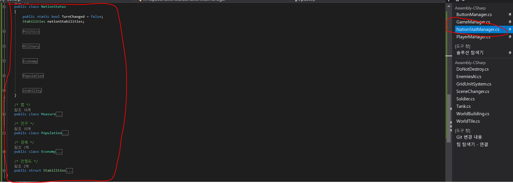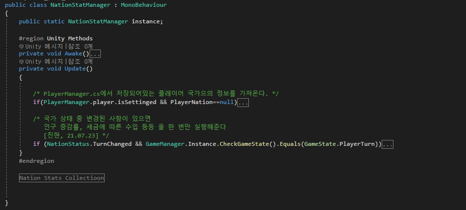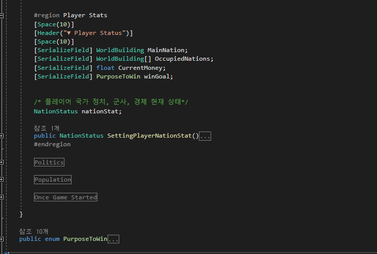 어제 만든 것을 리뷰를 해보면서 생각을 해봤는데 나중에 플레이어 뿐만이 아니라 적국들도 똑같은 변수들을 만들어줘야한다. 그래서 모든 국가들의 현재 상태들을 관리하고 데이터를 저장하는 국가스텟관리자를 따로 만들었다.