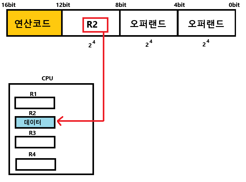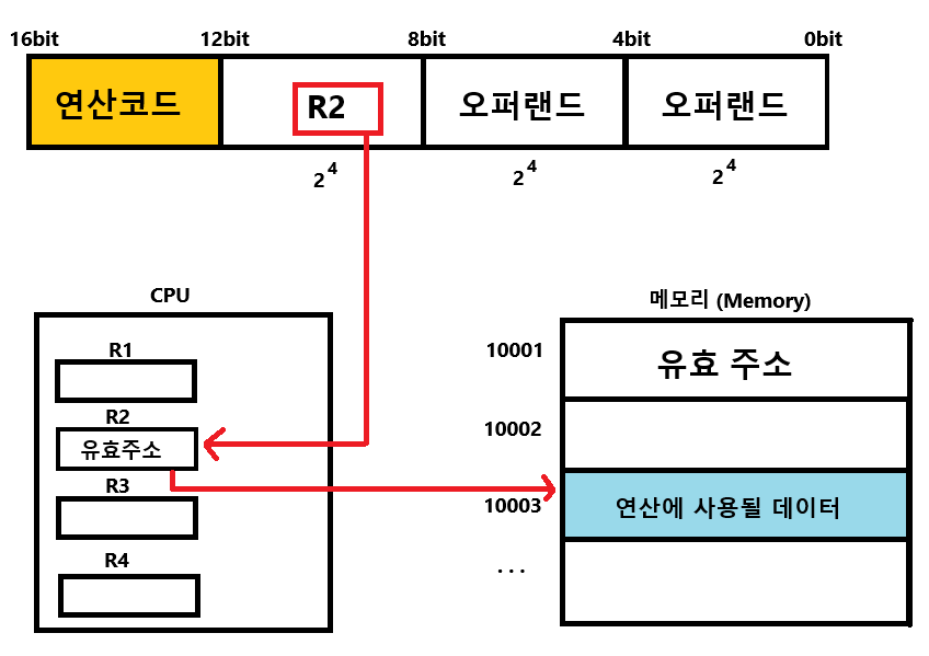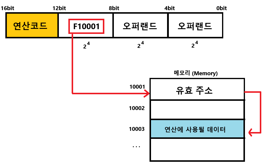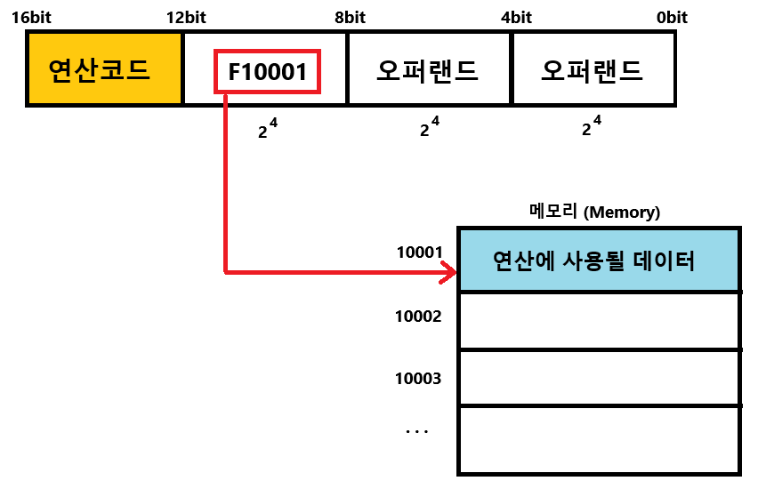| 직접 주소 지정 방식 | 주소 필드에 유효주소를 명시하는 방법이다. 하지만 여전히 유효 주소를 표현할 수 있는 범위가 연산 코드(4bit) 만큼 줄어들어 있기 때문에 유효 주소를 표현하는데에 일부 제약이 있을 수 있다. ![]() |
