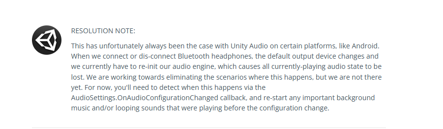 Unity 자체에서 사운드 출력기기 전환 시 Audio Engine을 re-init하고 있다. 이로 인하여 Audio Settings가 바뀌게 되므로 모든 Audio State의 추적이 끊기게 되어 Audio Mixer 등 오디오 관련 데이터들이 간접적으로 영향을 받을 수 있다.