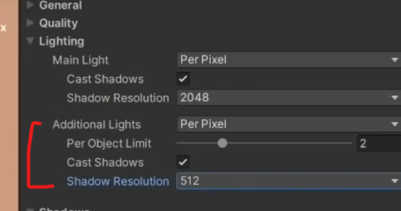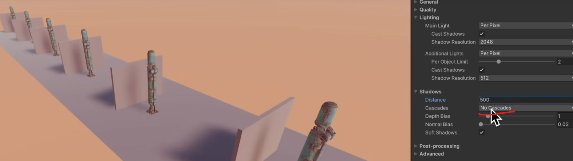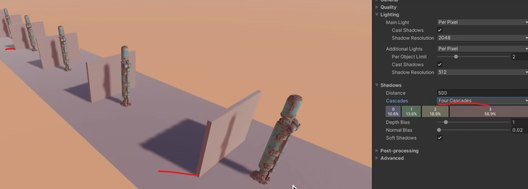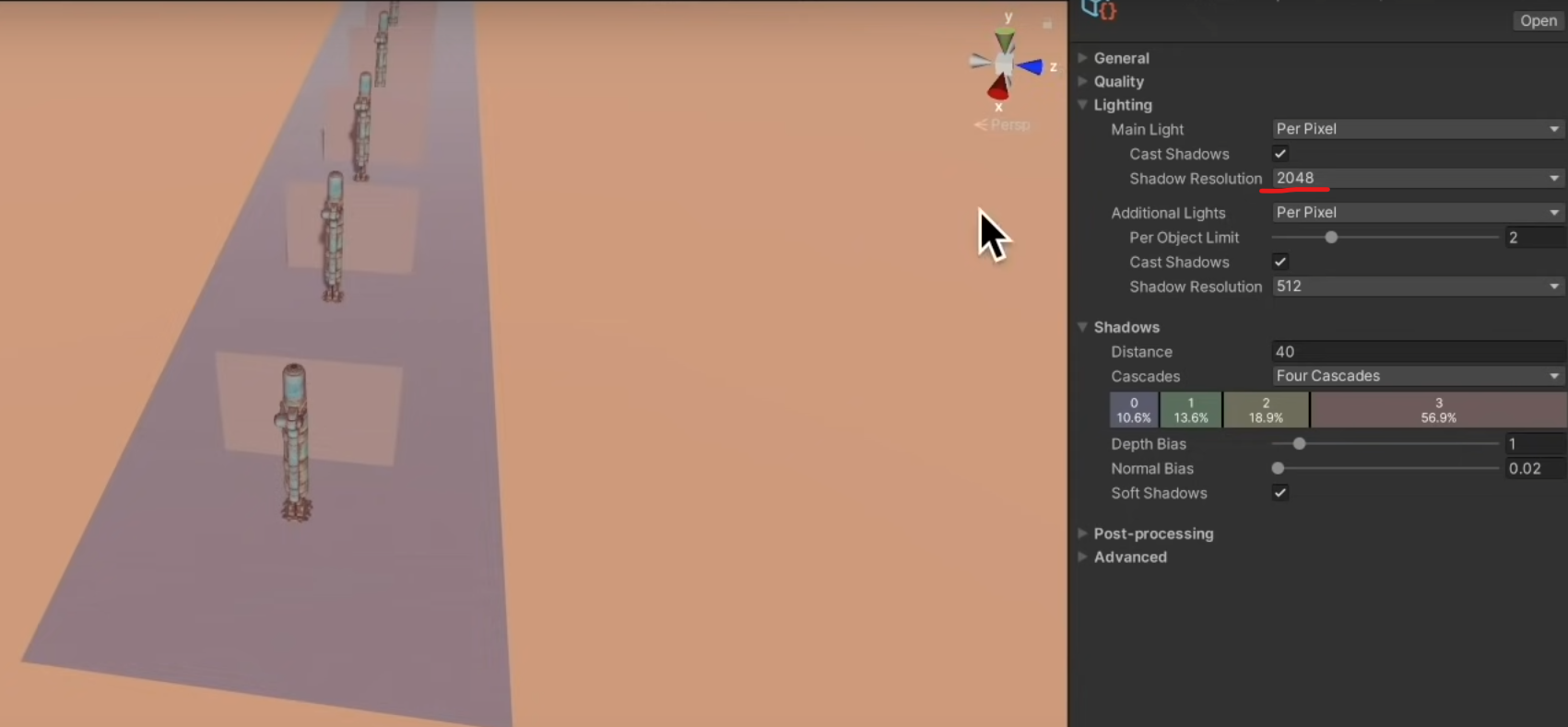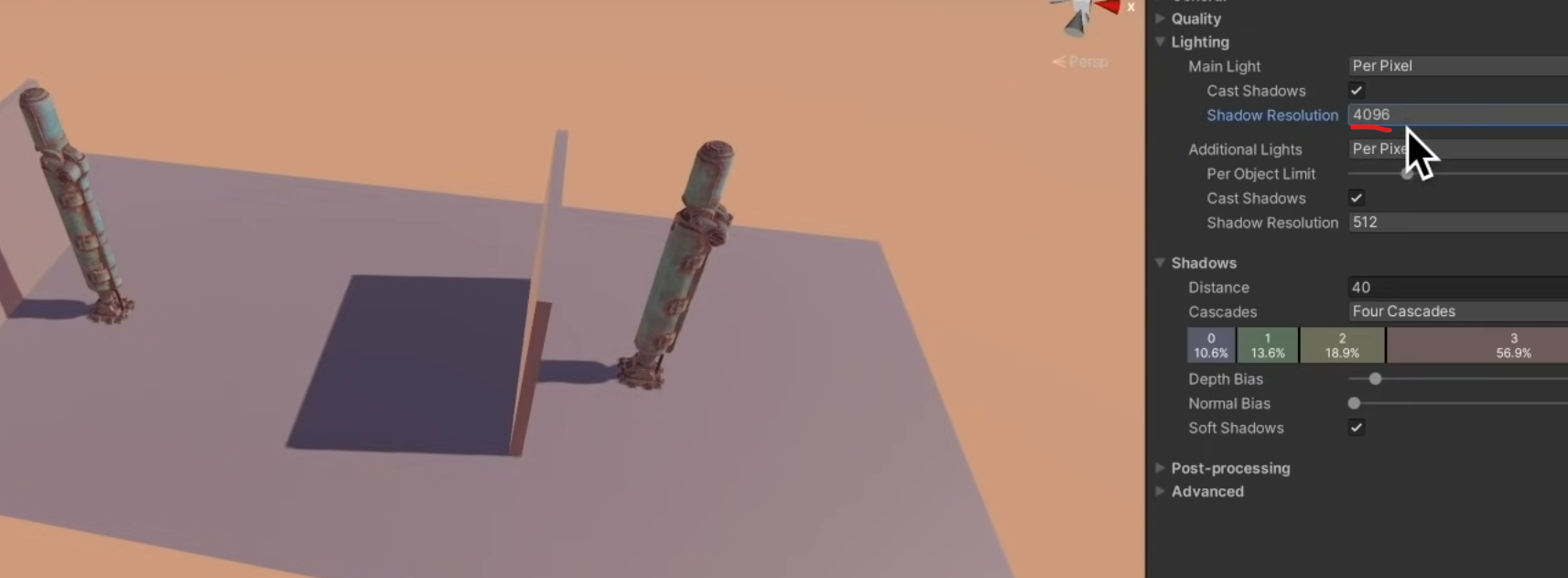 다만, Distance 값을 높게 설정하면 할수록 전체 거리의 그림자 해상도가 낮아지는데 그 이유는 Lighting 섹션 내 세팅한 Shadow Resolution 해상도가 Distance 값에 걸쳐 분산되기 때문이다. 그래서 모든 그림자가 설정한 해상도에 맞는 텍스처에 모두 담길 수 있도록 적절한 Distance 값이 필요하다.