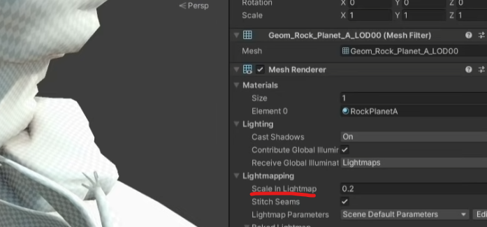 · 오브젝트 별로 베이크된 텍셀의 크기가 다른 것을 확인할 수 있는데 이는 개체의 Inspector/Mesh Renderer를 확인해보면 Lightmapping 섹션 내 Scale을 조정해주면 된다. 이 Scale 값은 라이트맵에서 오브젝트가 차지하는 공간을 의미한다.