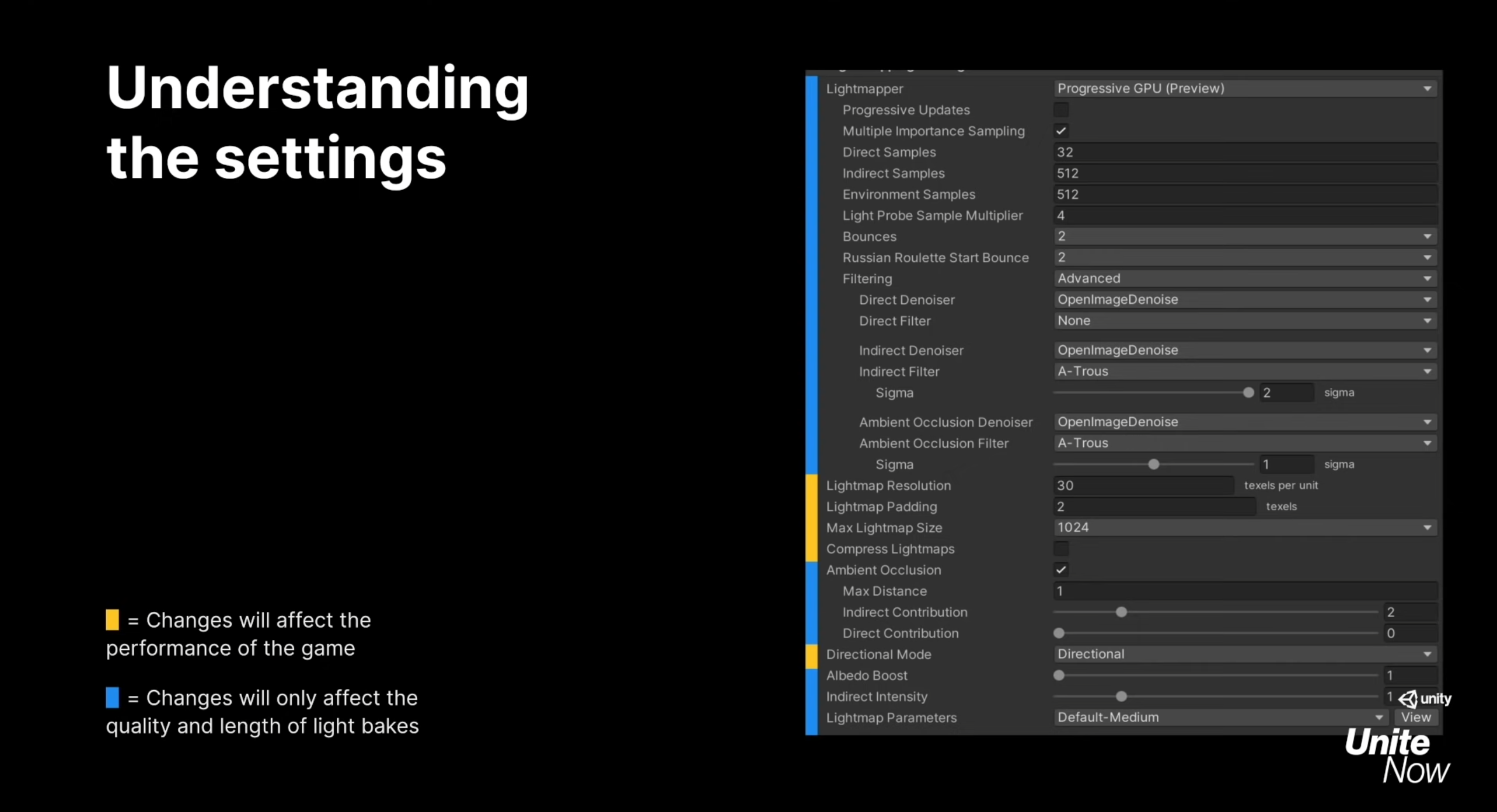 노란색은 라이트맵의 해상도, 크기 등을 조절하게 되는데 이러한 설정에 따라 파일이 커지거나 작아져서 런타임 중 관리해야할 메모리의 양이 달라질 수 있는 요소이다. (성능에 미치는 요소)