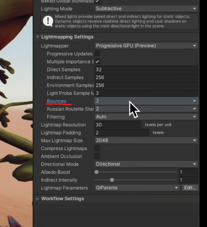 · 중요한 설정 중 하나는 Lightmap Resolution인데 이는 씬의 유닛(Unit; meter) 하나당 사용되는 텍셀의 수를 정의한다. 즉, 텍스처의 픽셀의 수를 결정하는 것이다.