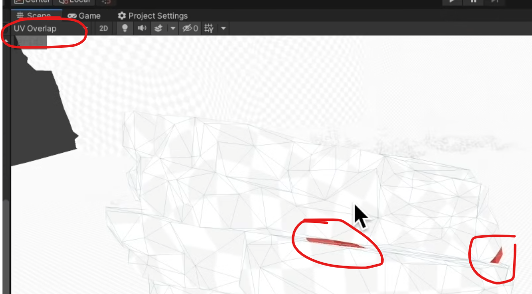 3. 더 쉬운 방법으로 UV가 겹치는 부분들이 있는지 확인할 수 있는데 씬 뷰 세팅을 UV Overlap으로 설정하면 볼 수 있다.