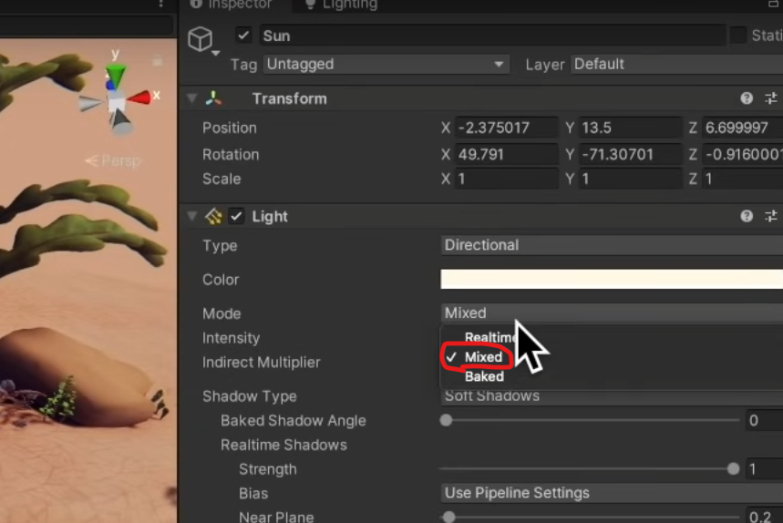 3. 방향 광원 [Directional Light]을 Mixed로 설정해준다.
