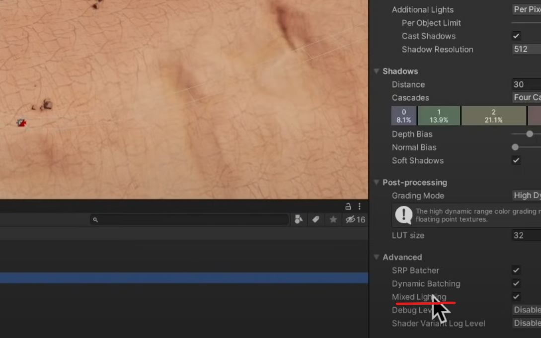 1. URP Asset에서 Mixed Lighting을 활성화 해줘야 한다.