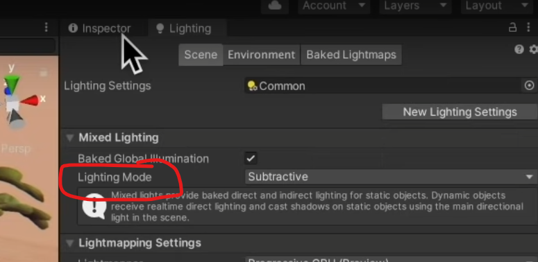 2. [Lighting 패널 / Scene / Mixed Lighting]에서 어떤 혼합 조명 모드를 사용할지 선택해준다.