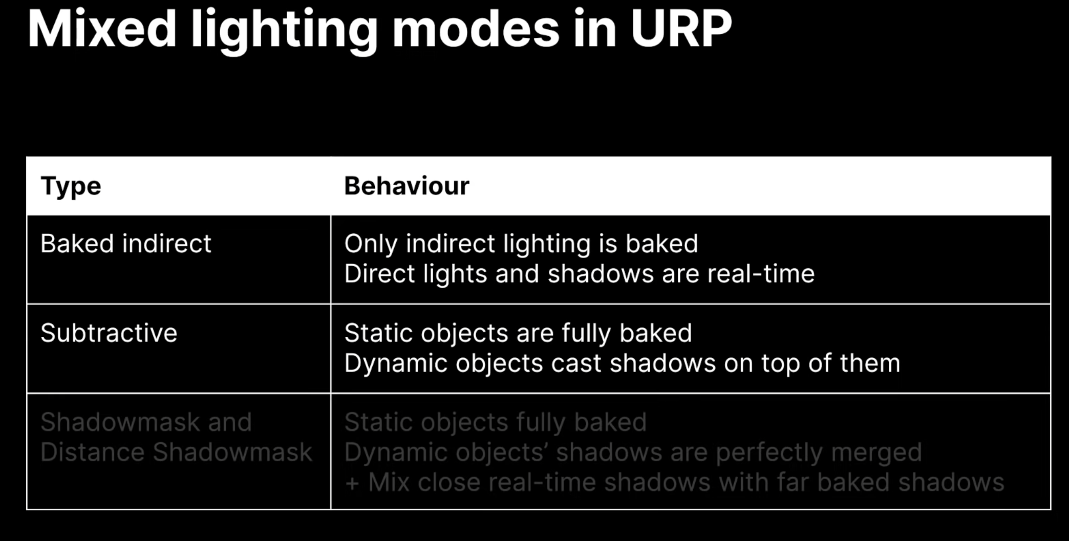 URP는 3가지 혼합 조명 모드 중 2가지인 Baked Indirect와 Subtractive를 지원한다. (2019.3f 기준)