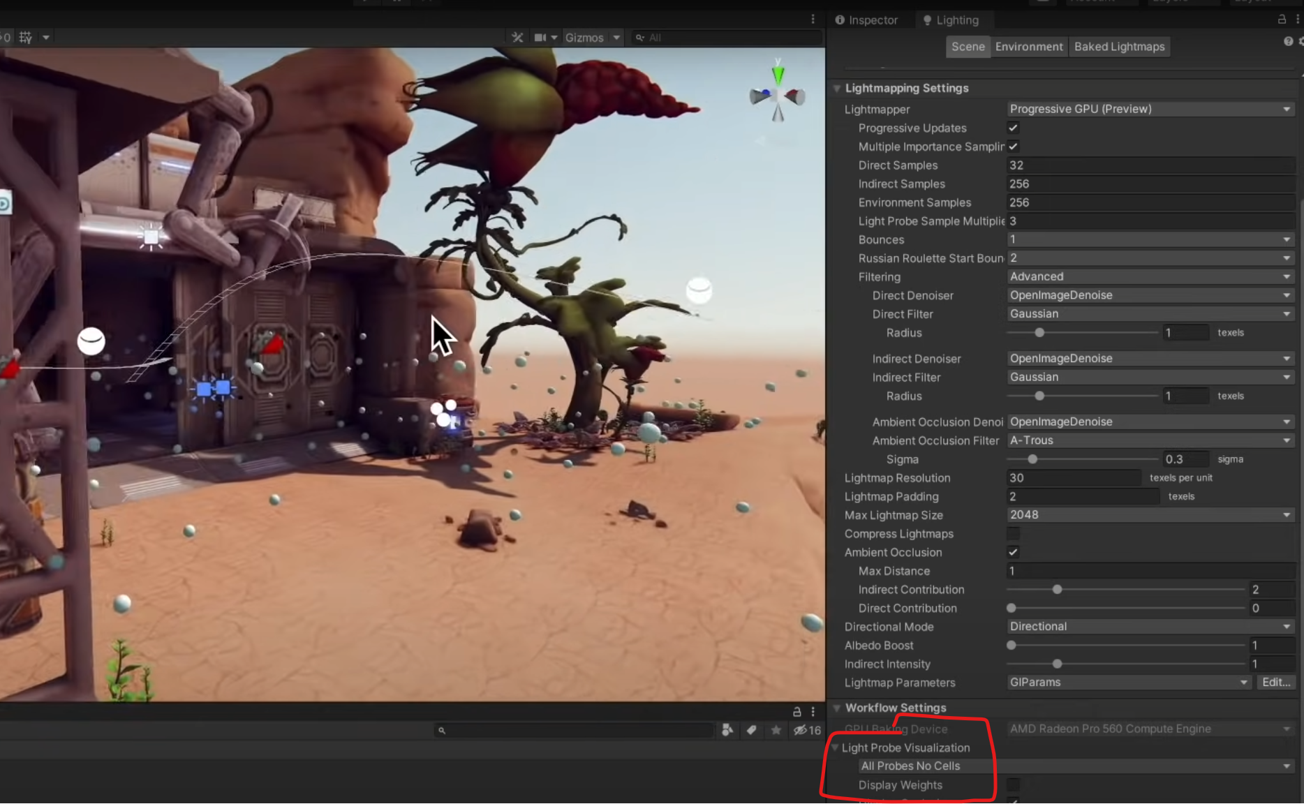 2. 라이트 프로브 그룹을 선택하지 않더라도 씬 전체에 존재하는 프로브들을 확인하고 싶다면 Lighting패널에서 Light Probe Visualization 설정값을 "All Probes No Cells"로 변경해주면 된다.