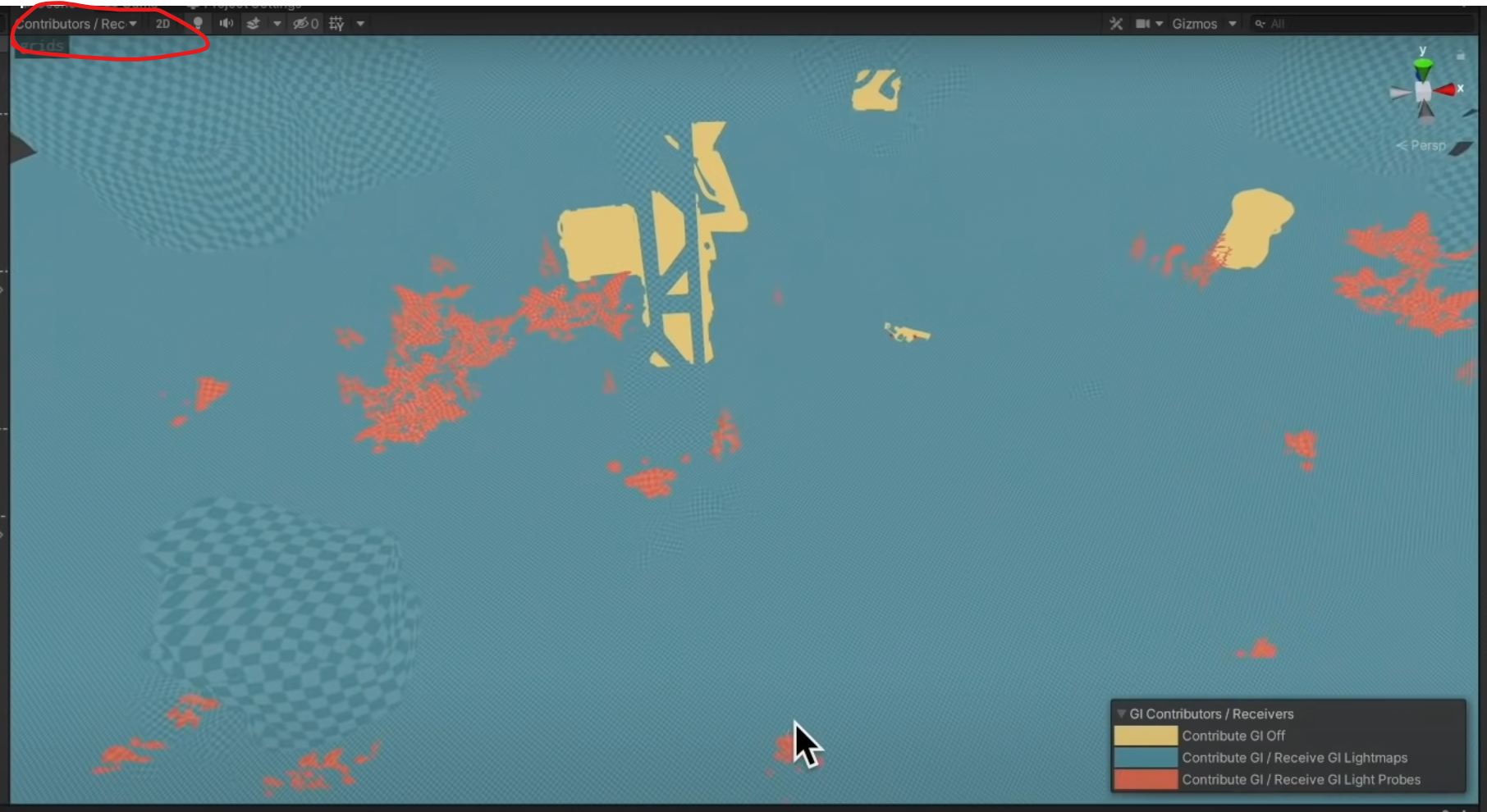 3. 씬 뷰 내 Global Illumination 섹션에서 [Contributors / Receivers]를 선택하면 디버그하며 오브젝트 설정을 잊어버렸거나 올바르게 세팅 되었는지 한 눈에 확인할 수 있다.