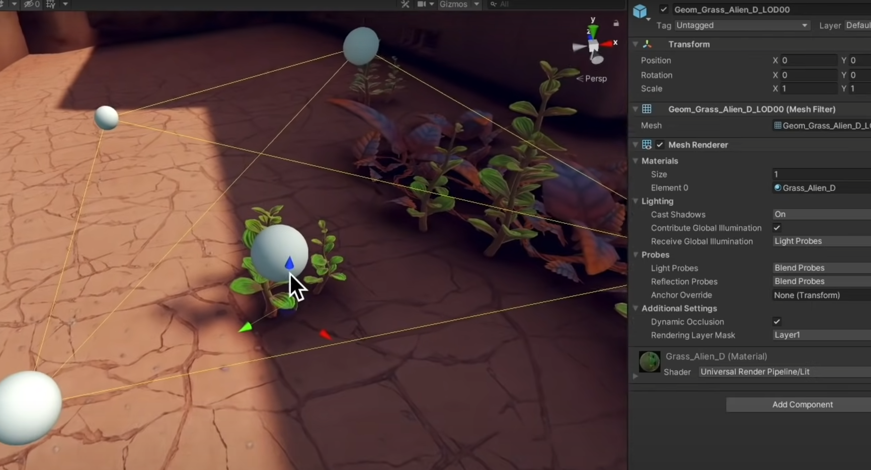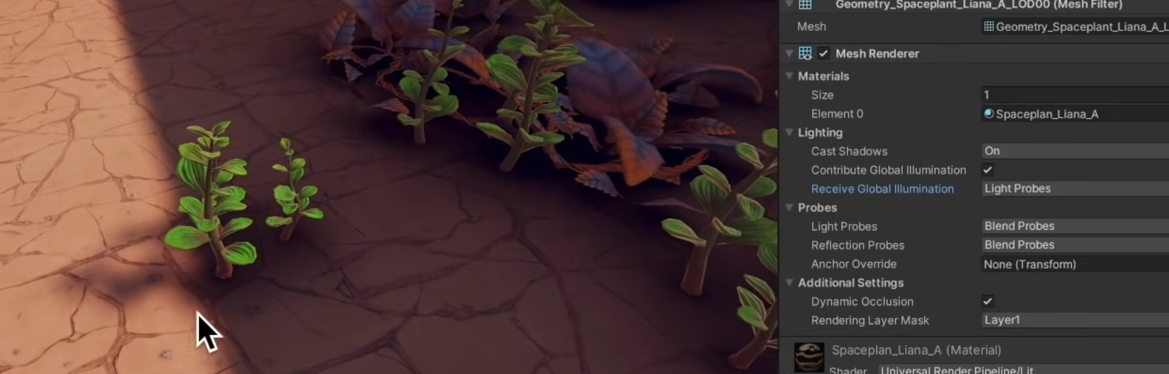 Lightmap Scale을 조절할 수도 있으나, 그렇게 된다면 식물의 디테일 캡처의 정확도가 떨어지므로 Receive GI를 Lightmap이 아니라 Light Probes로 대체하면 좋다. 이런 경우 그림자는 지면의 라이트맵에 베이크 되지만 오브젝트 자체는 라이트 프로브의 조명을 받는다.