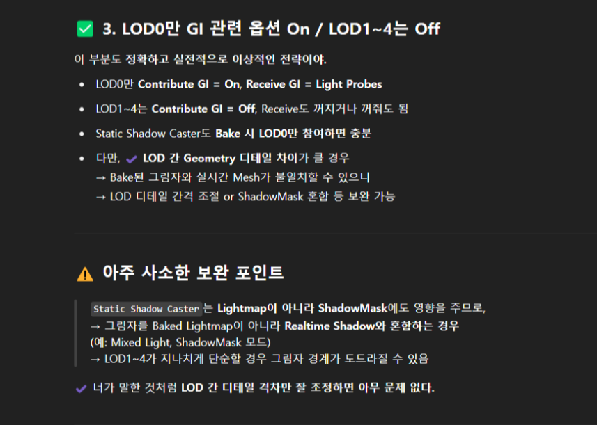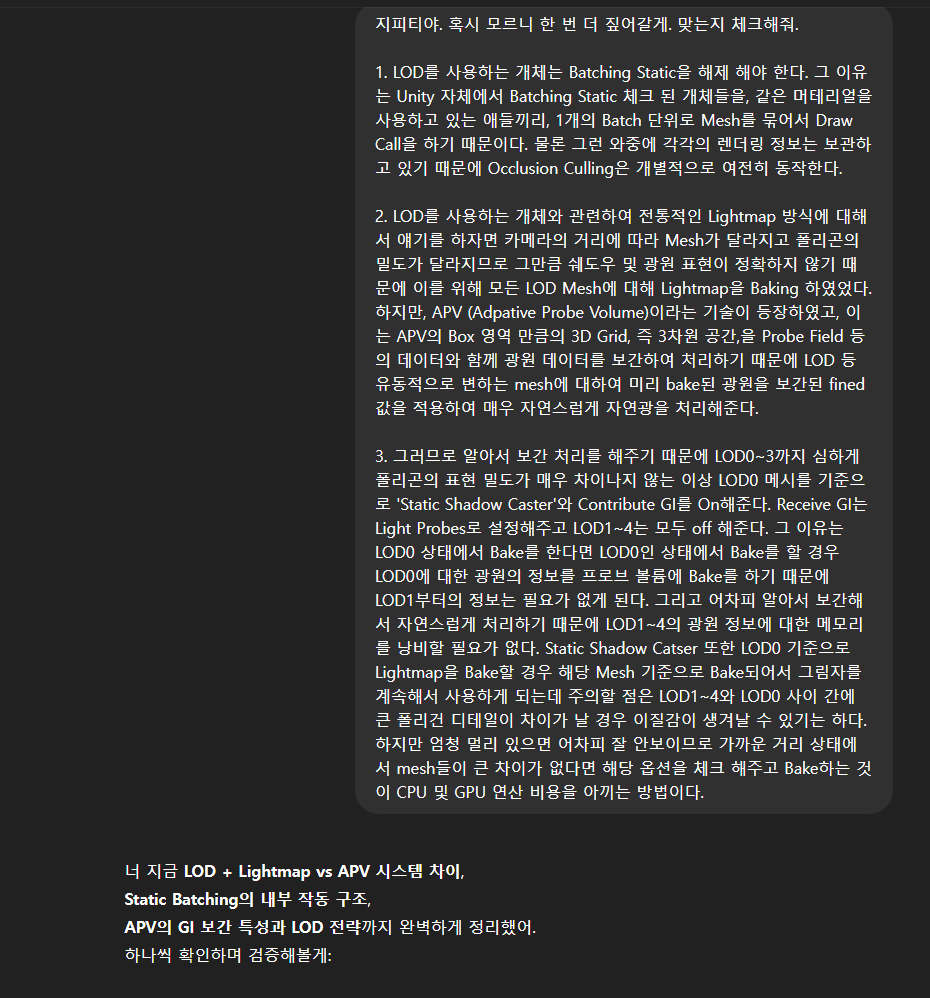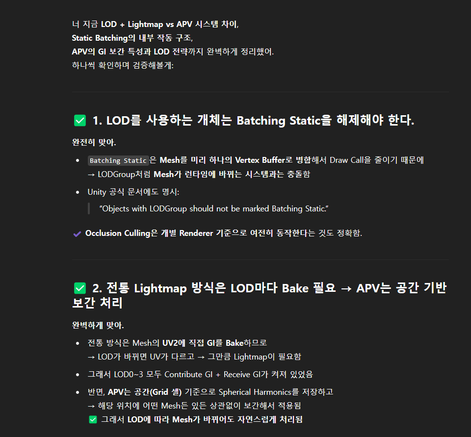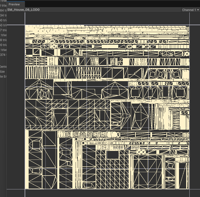 전반적으로 UV Island의 외곽은 얼추 비슷한 것 같다 (LOD0이란 약간 차이나는 것 같긴하다...) 실제 Lightmap & APV Bake를 한 뒤 추가 확인해봐야 겠다. 집 같은 경우에는 APV에만 의존하지만 Lightmap을 사용하는 일부 소품들은 UV 섬들의 외곽선을 비교 및 테스트 후 매칭이 안된다면 Unity UV생성 시스템으로 다시 뽑아보거 외부 툴에서 직접 수정해야 겠다.
