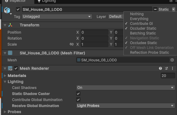 APV 프로브로 간접광 정보를 베이크 하기 위해 Receive GI를 Light Probe로 설정하고 LOD 개체이므로 Batching Static을 해제했다.