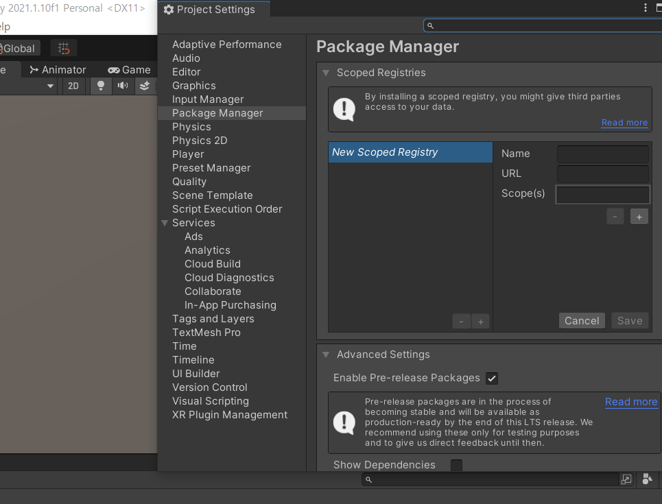 1. 먼저 Project Settings -> Package Manager에서 Advanced Settings에 있는 Enable Pre-release를 체크 표시해준다.