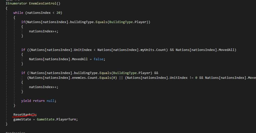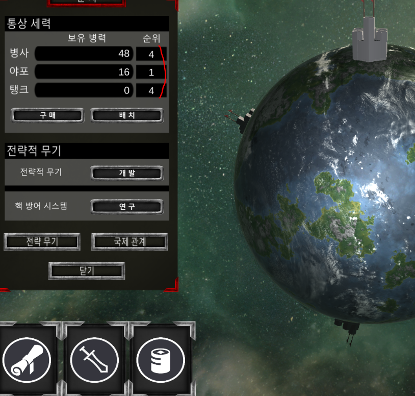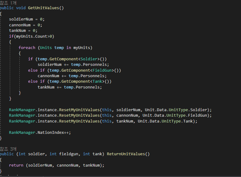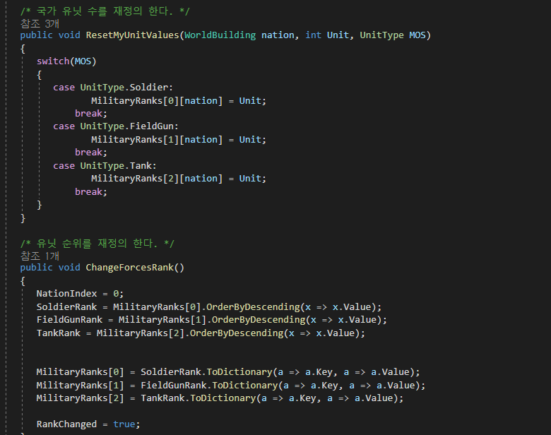 랭크 관리자에서는 딕셔너리<국가, 유닛 숫자>를 3개의 리스트(병사, 야포, 탱크)를 보유하고있는데 매 턴이 끝날 때마다 모든 국가들이 본인이 알아서, 방금 말했던 함수로, 자국의 유닛 수를 재설정해준다.