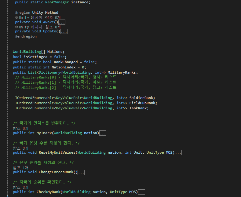 플레이어를 포함한 모든 나라의 병종별 국방력 순위를 구현하기 위해 랭크매니저 스크립트를 만들었다.