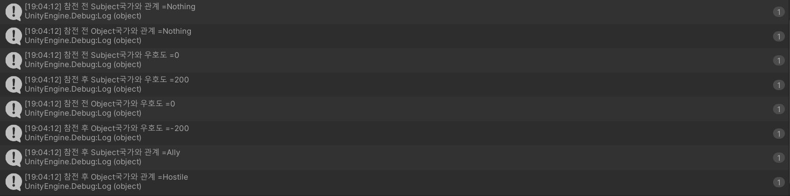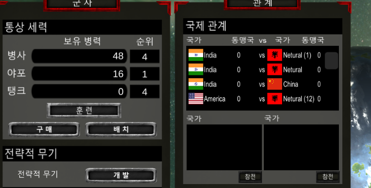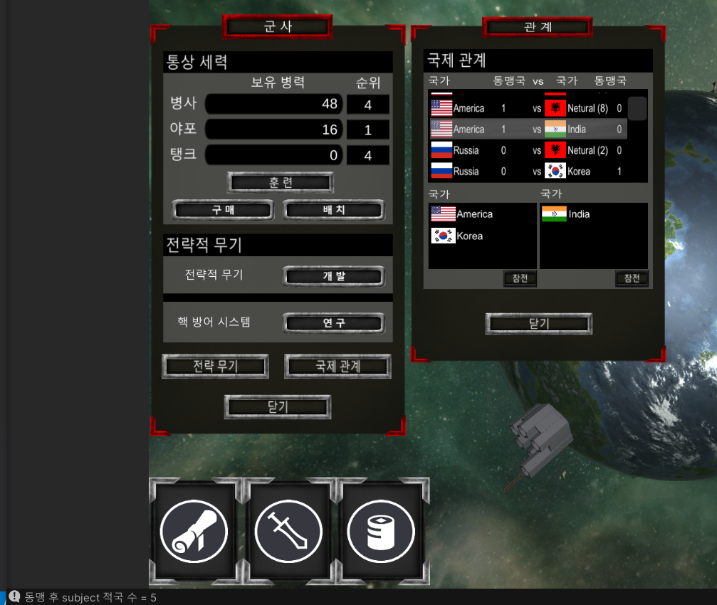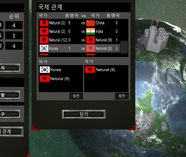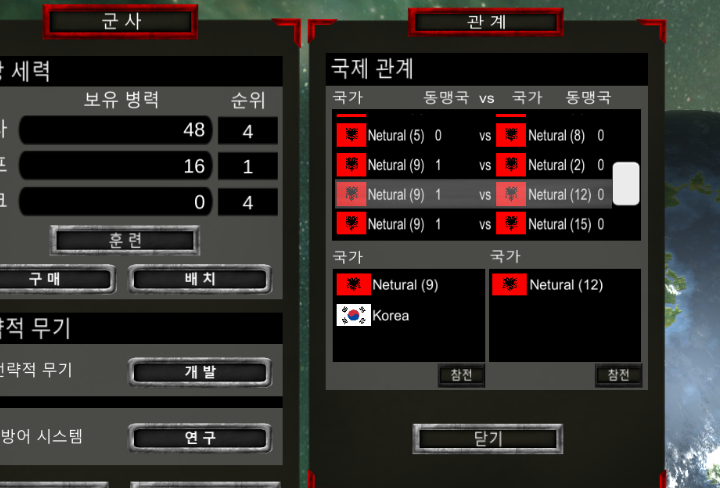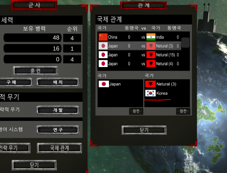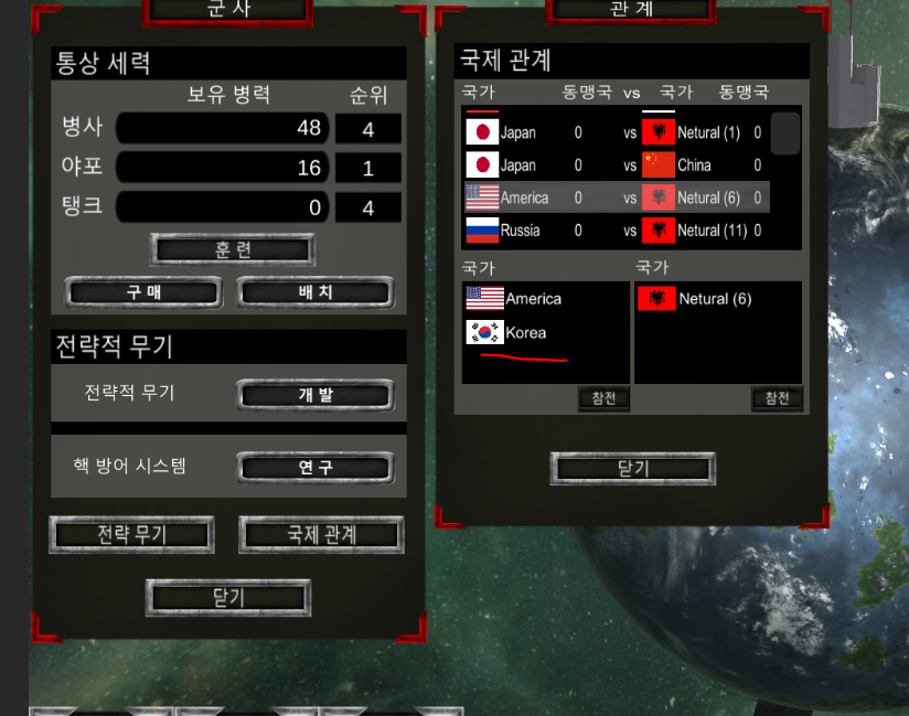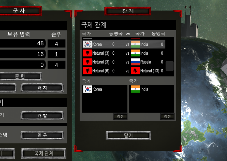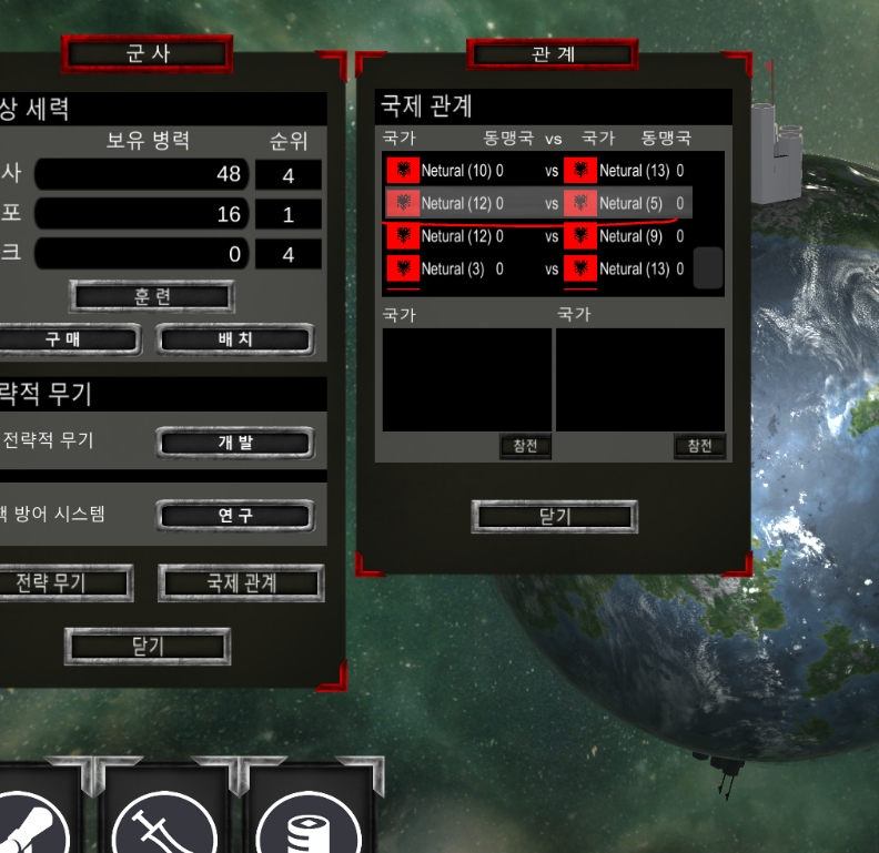 처음 월드 씬에 들어갔을때 국제관계가 형성이 되는데 이후 우주씬 군사 UI에서 전쟁중인 국가들 리스트를 확인할 수 있다.