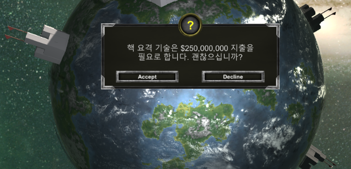 위에 버튼을 클릭 했을 때 일정한 금액을 지불하고 핵 공격 혹은 요격 미사일을 연구할 것인지 공지를 띄워야한다.