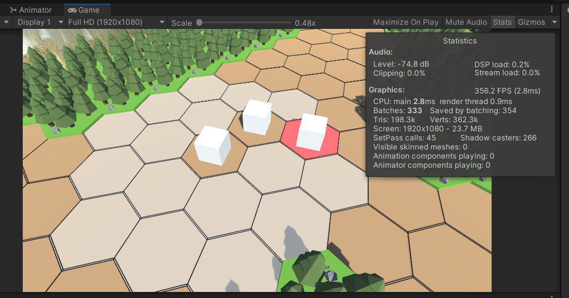 여러 차례의 수정 및 실패를 계속 반복하다가, 몇 시간 뒤, 드디어 위 사진들 처럼 이동 가능 범위 내에 타일들이 표기가 되고 적군이 있는 곳은 빨간색으로 표기가 된다. 아군 유닛이 있는 곳은 이동 불가능한 상태이다. 그러나 이동 시