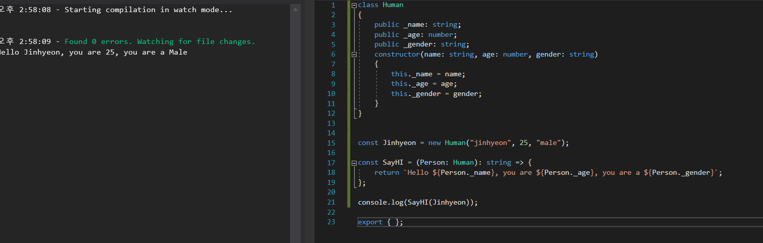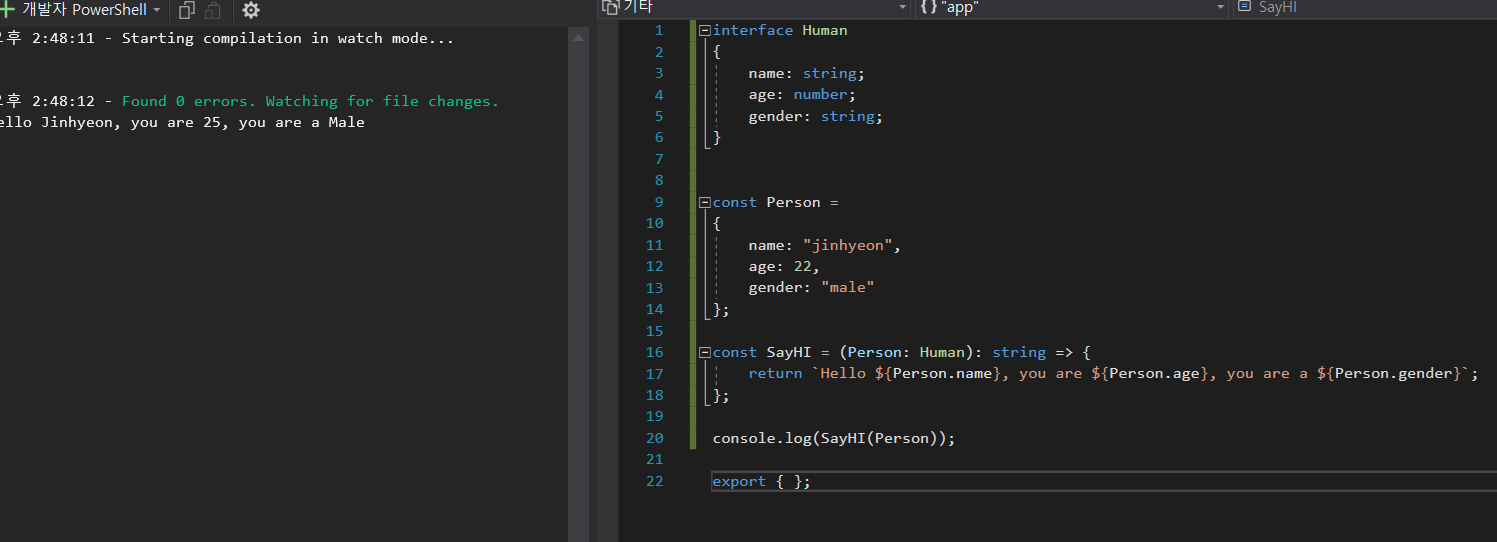 그래서dist에 기록된 결과물인 app.js(javascript)를 보면 interface가 없다.