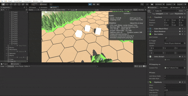 여러 차례의 수정 및 실패를 계속 반복하다가, 몇 시간 뒤, 드디어 위 사진들 처럼 이동 가능 범위 내에 타일들이 표기가 되고 적군이 있는 곳은 빨간색으로 표기가 된다. 아군 유닛이 있는 곳은 이동 불가능한 상태이다. 그러나 이동 시